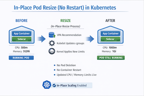 Starting Kubernetes 1.35, the In-Place Pod Resize moves to stable version, which enables the adjustment of CPU and memory requests and limits within a running Pod, often without requiring a container restart.